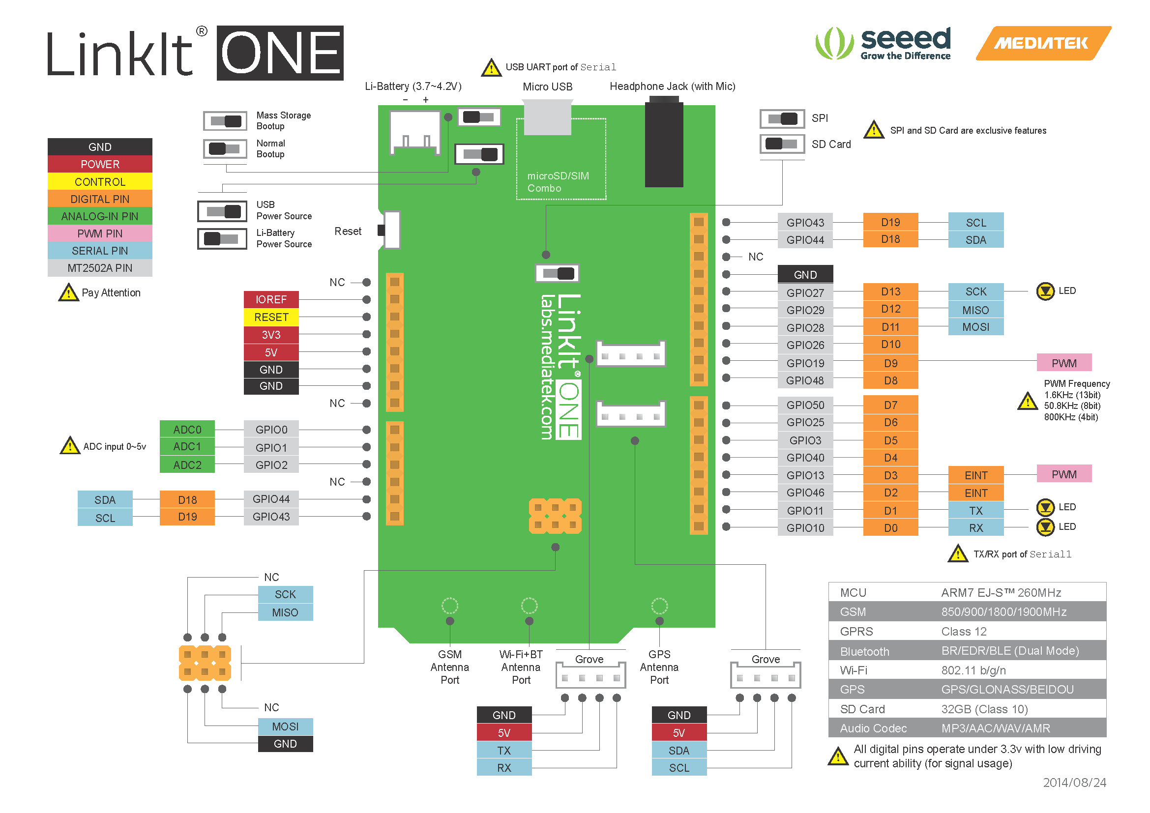Board phát triển IOT LinkIt ONE là một bo mạch hiệu năng cao, mã nguồn mở được phát triển để ứng dụng các dự án Wearables và IoT. Nó dựa trên SoC hàng đầu thế giới Wearables, MediaTek Aster (MT2502) kết hợp với chipset Wi-Fi (MT5931) và GPS (MT3332) để cung cấp cho bạn quyền truy cập vào tất cả các tính năng của MediaTek LinkIt.