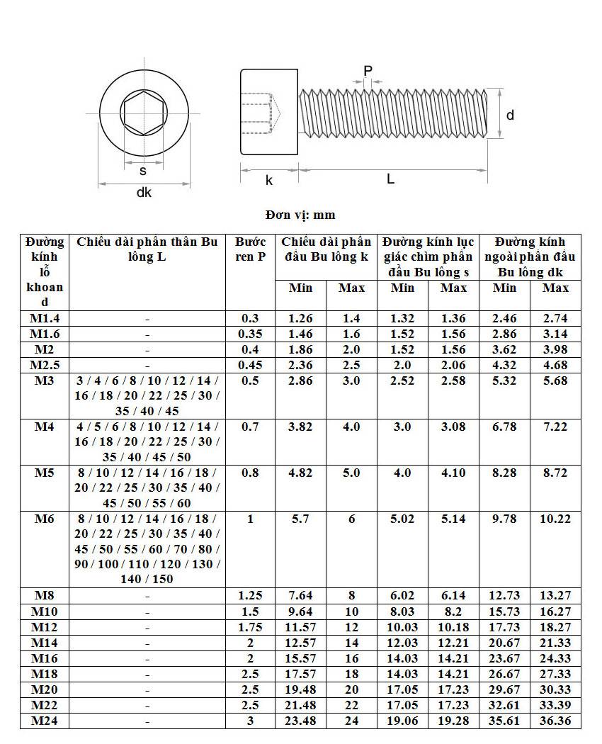 TỔNG QUAN Bulong Lục Chìm Inox 304 thường sử dụng khi cần các mối ghép vững chắc (động cơ bước, các thanh nhôm định hình...)  trên các máy in 3D hoặc CNC mini. Với đặc điểm lỗ lục lăng sâu, bulông lục lăng đầu trụ có thể xiết với mô men lớn. Bulông lục lăng đầu trụ kích thước ren M2, M3, M4,...