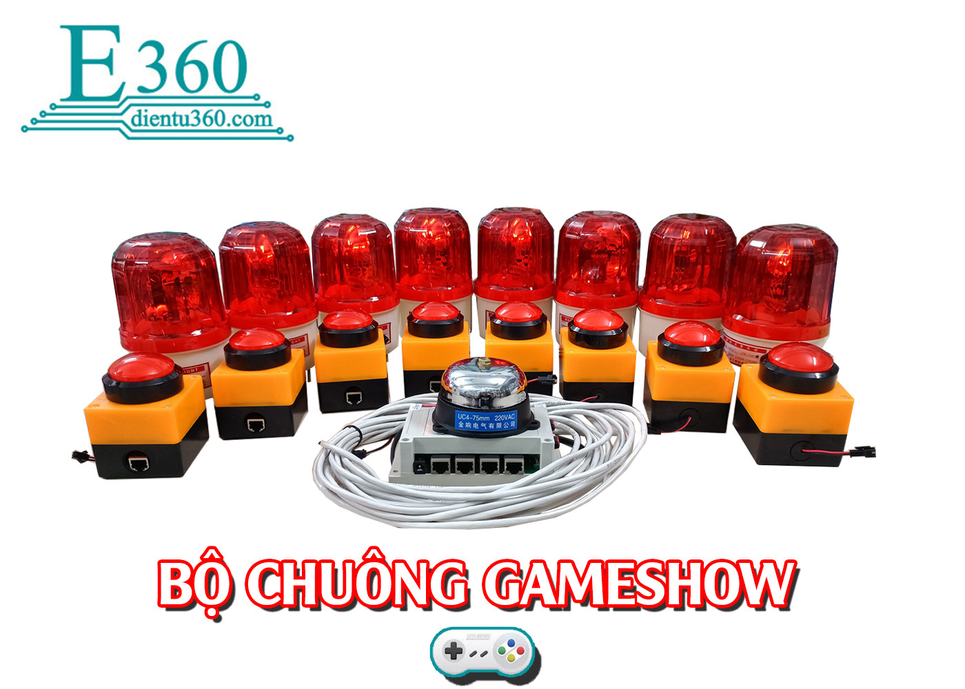 Bộ chuông Game Show do E360 sản xuất, mạch sử dụng vi điều khiển để lập trình. Đảm bảo độ chính xác cao trong mọi tình huống. Có thể sử dụng tối đa 8 đội chơi. Bộ chuông có giá phụ thuộc vào số đội chơi.