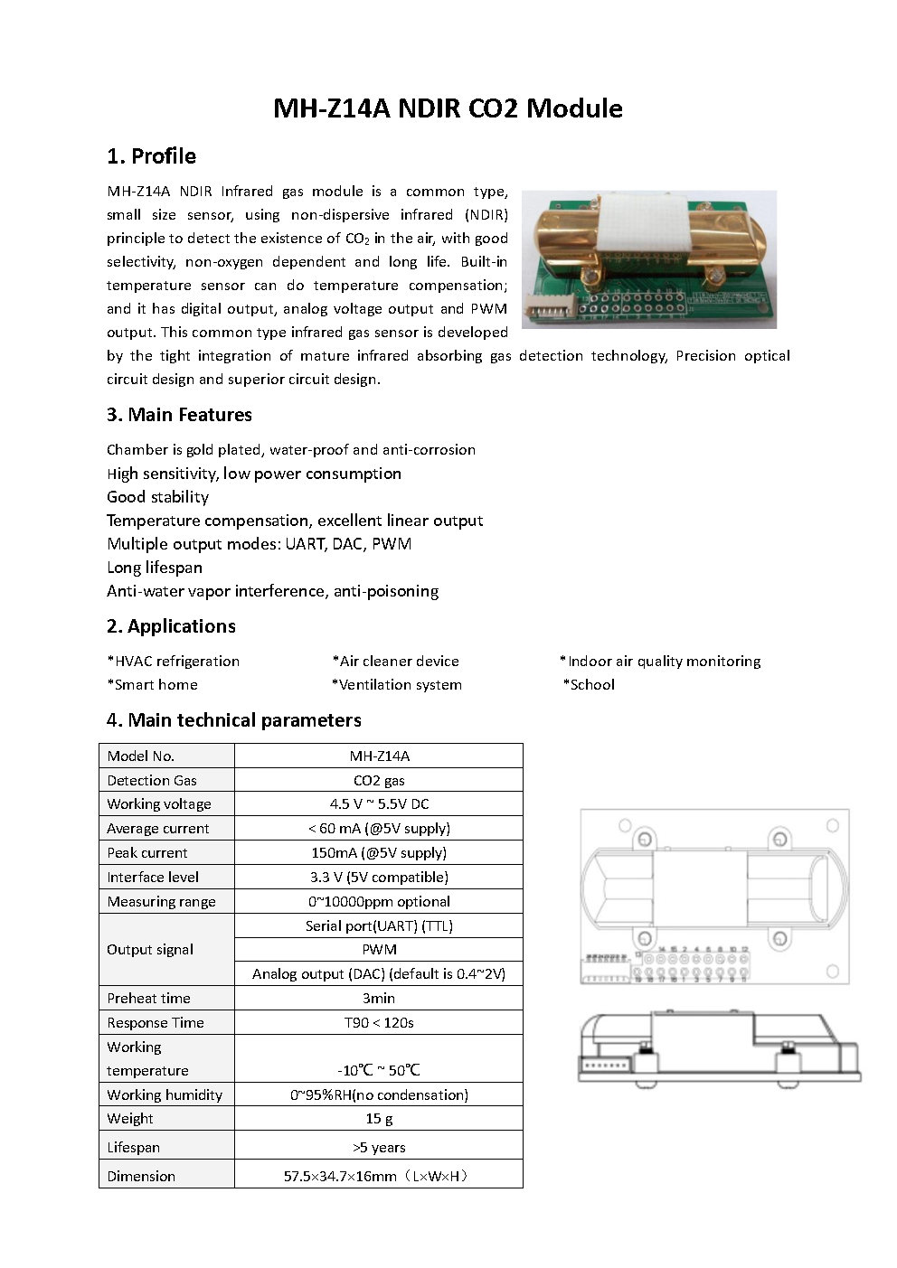 MH-Z14 khí CO2 cảm biến là cảm biến đa năng thông minh sử dụng hồng ngoại không tán sắc (NDIR) để phát hiện CO2 có mặt trong không khí. Cảm biến có tính chọn lọc tốt, không phụ thuộc vào nồng độ oxy và tuổi thọ lâu dài. Có nhiệt độ bù trừ; cả hai đầu ra Digital và Analog. Cảm biến CO2 là một cảm biến hiệu suất cao kết hợp hồng ngoại hấp thụ phát hiện khí, công nghệ quang học chính xác.