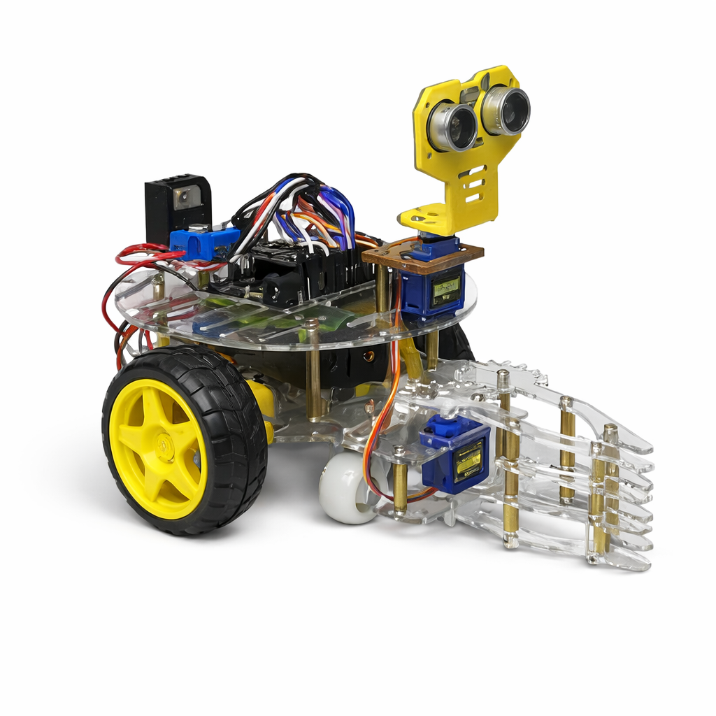 Thiết bị chấp hành và linh kiện: Động cơ 1 chiều (có tích hợp sẵn modun điều khiển động cơ 1 chiều L298N), Động cơ servo - Động cơ bước(Tích hợp board mở rộng cùng driver điều khiển động cơ bước) - Đèn LED, loa, còi, dây cáp
