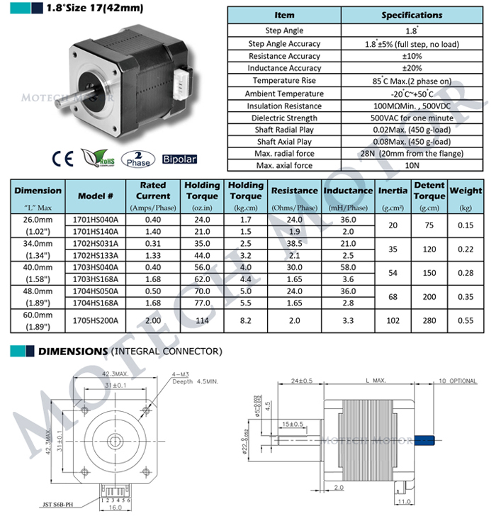 - Cường độ định mức 1.68A, mô men giữ 0.55 Nm, góc quay mỗi bước 1.8 °