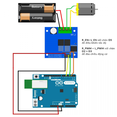 Chân R_EN , L_EN nối chung lại rồi nối với PWM (VD chân digital 5) để điều khiển tốc độ động cơ.