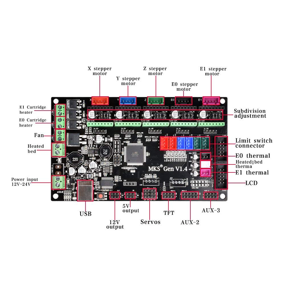 -Main 3D MKS Gen V1.4 kết hợp Mega 2560 và ramps1.4 được đặt trên một bảng mạchvà driver a4988 dvr8825 để điều khiển động cơ bước.