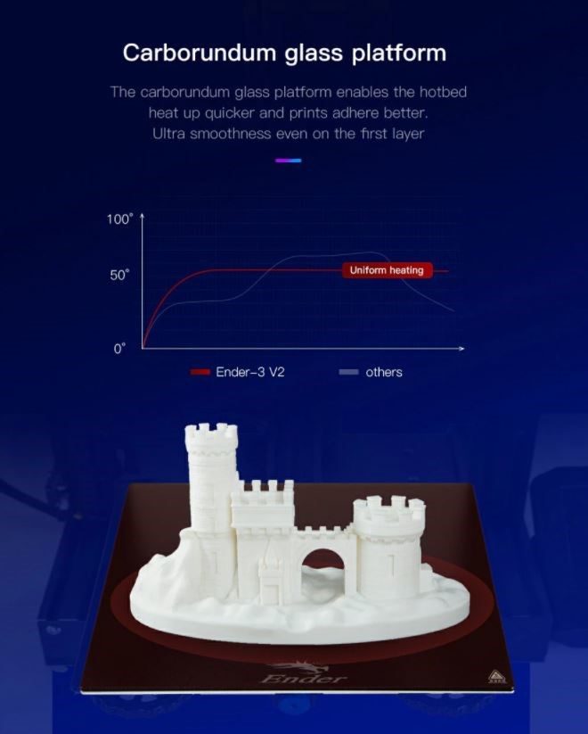 – Bàn nhiệt bằng kính Carborundum. Bàn kính loại này cho phép bàn nhiệt nóng lên nhanh hơn và các mẫu in bám dính tốt hơn mà không bị cong vênh.